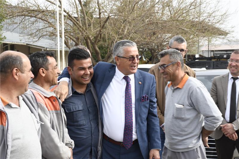 Arslanbucak Mahallesindeki Kemer Belediyesi Hizmet Alanında belediye personeliyle buluşan Belediye Başkanı Topaloğlu'na, Kemer Belediye Başkan Yardımcıları Emin Gül, Baki Yalın ve Gülsüm Bal ile birim müdürleri eşlik etti.