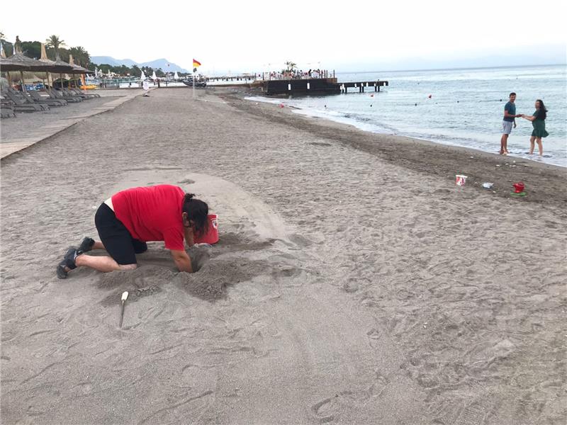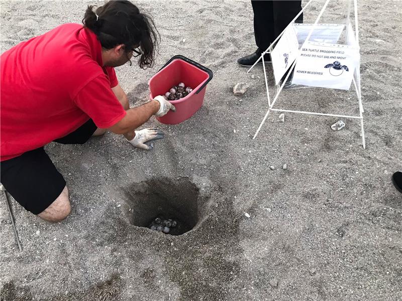 Sahil bandına yakın yere yumurtladığını gören otel yetkilileri, durumu Kemer Belediyesi Hayvan Barındırma, Tedavi ve Rehabilitasyon Merkezinde görevli veteriner hekim Fevzi Uzun'a bildirdi.