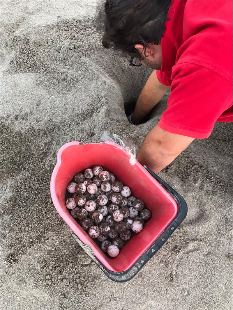 Uzun, yuvadaki 75 caretta caretta yumurtasını dikkatle ve özenle çıkararak, sahil bandından daha uzak bir alana açılan çukura koydu.