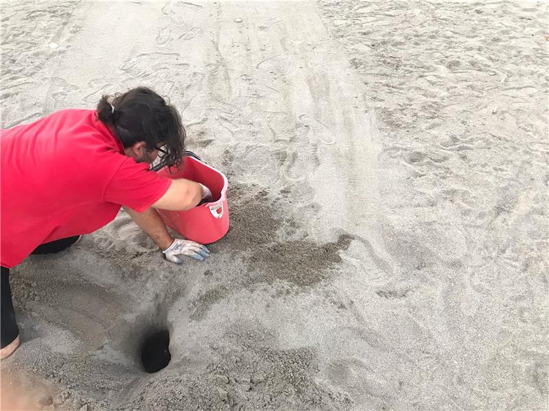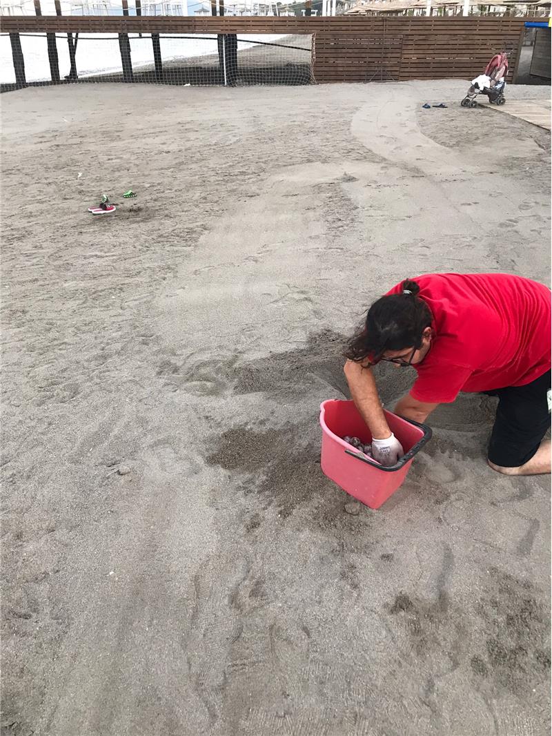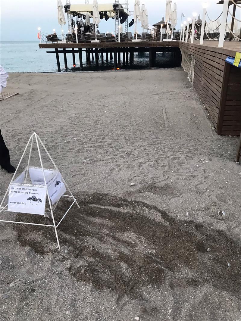 Kemer'e bağlı Beldibi Mahallesi'nde bir otelin sahiline yumurtlayan caretta caretta yuvası, Kemer Belediye ekiplerince uzak bir alana taşındı.