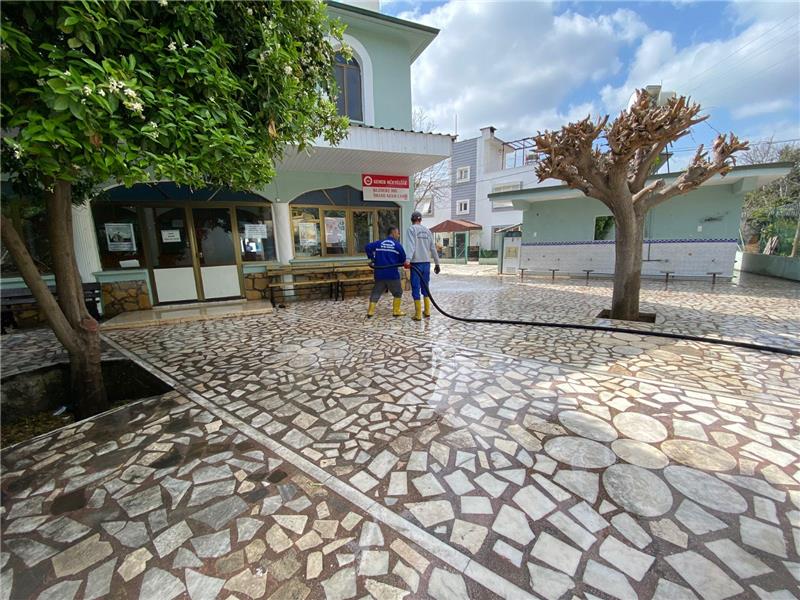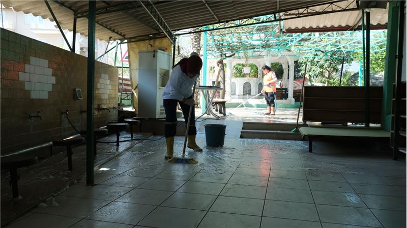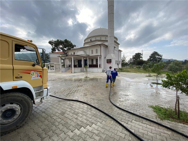 Park ve Bahçeler Müdürlüğü ekipleri, su tankerleri ile ilçe genelindeki camilerin bahçe ve avlularını yıkarken, temizlik işleri müdürlüğü ekipleri de cami içerisinde temizlik çalışmaları yapıyor.