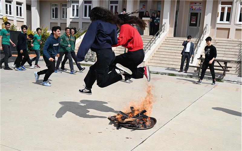 Başkan Topaloğlu, Nevruz Bayramı kutlamaları kapsamında, okul bahçesinde yakılan nevruz ateşinin üzerinden atlayarak, demir dövdü. Başkan Topaloğlu'na öğretmen ve öğrenciler de eşlik etti.