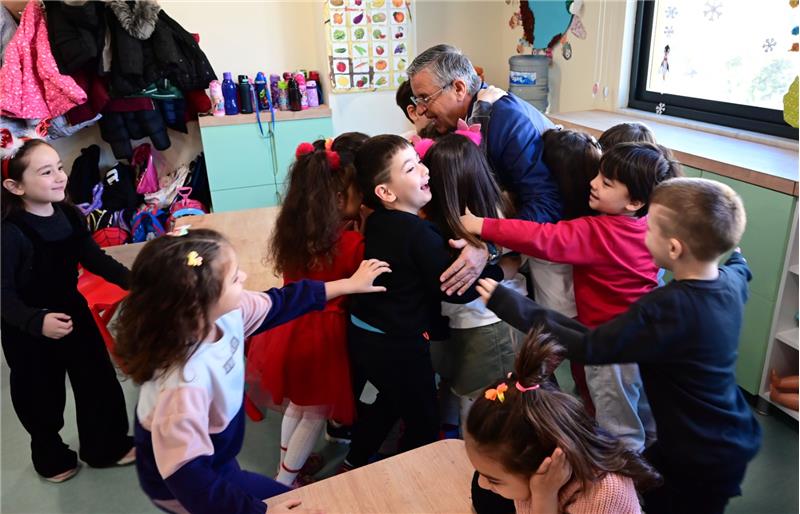 Karşılarında Başkan Topaloğlu'nu gören minikler, ‘Başkan dede geldi' diye söylemeleri ve Başkan Topaloğlu'na sarılmaları renkli görüntüler oluşturdu.