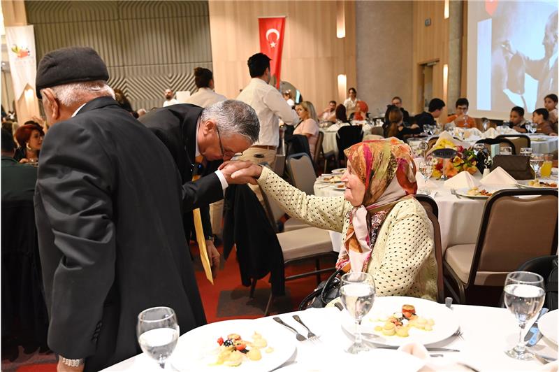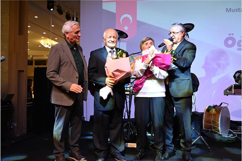1975 yılında Rize Güneysu Kıbledağı Köyü'nde öğretmenlik hayatına başladığını hatırlatan Başkan Topaloğlu, “Cumartesi günü ilk görev yerim olan bu yerde okuttuğum ve mezun ettiğim ilk öğrencilerden Mustafa Büyük ve ailesi bizi ziyaret etti. Okul numarası 19'du. Bize sürpriz yaptı ve çok mutlu olduk. Aydın Ortaklar Öğretmen Okulu'nda öğretmenim olan iki değerli insan aramızda. Yonca ve Ünal Yurtçu öğretmenlerimin ikisi de beden eğitimi öğretmeniydiler ve çok idealisttiler. Öğretmenlerim, Aydın Ortaklar Öğretmen Okulu'nu başarıdan başarıya koşturdular. Ünal Hocam emekli olduktan sonra Antalya Koleji'nde çalıştı ve Antalya Koleji'ni basketbol branşında Türkiye birincisi yaptı. Bizleri idealist bir şekilde yetiştirdi. Bana verdikleri emeklerden dolayı kendilerine teşekkür ediyorum.” diye konuştu. Daha sonra öğretmenlerini sahneye davet eden Başkan Topaloğlu, üzerinde emeği olan öğretmenlerine çiçek takdim etti.