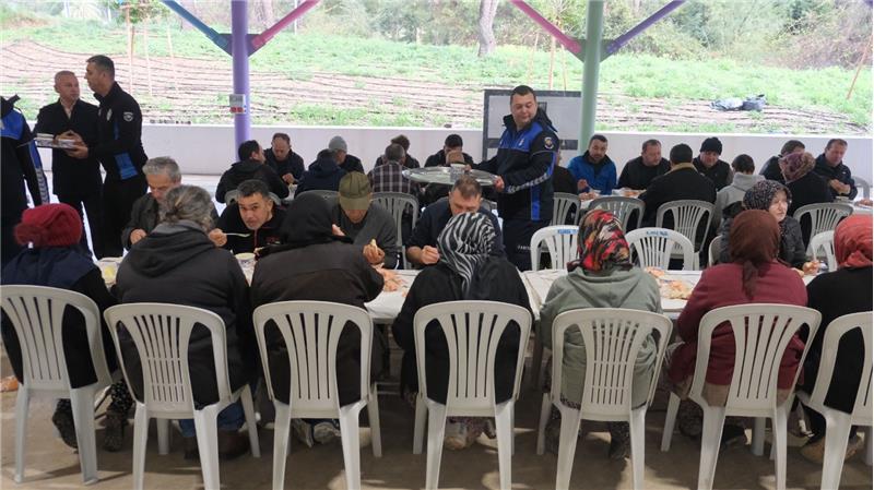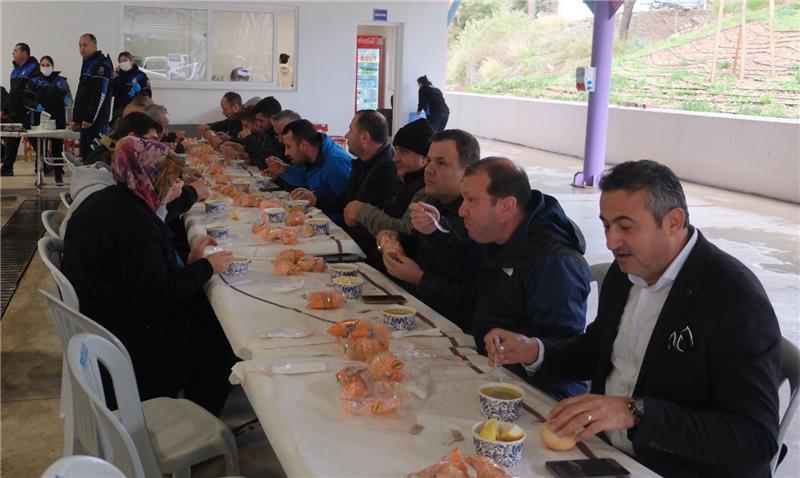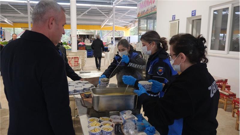Zabıta ekiplerinin kurduğu masalara davet edilen pazar esnafı, soğuk havada sıcak çorbalarını içti.