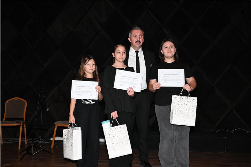 Protokol üyeleri, program sonrasında öğretmen ve öğrencilerle hatıra fotoğrafı çektirdi.
