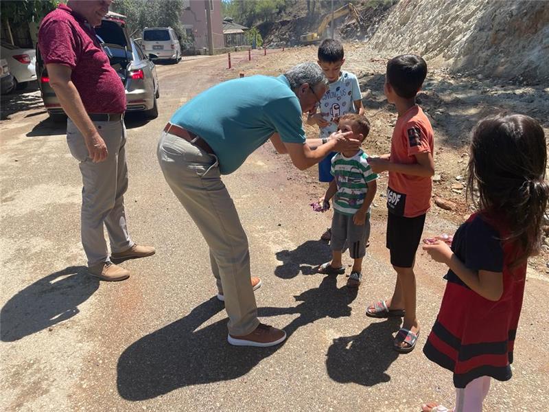 Öte yandan Başkan Topaloğlu, Çamyuva'daki incelemeleri sırasında yanına gelen çocuklarla sohbet etti.