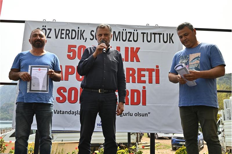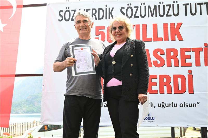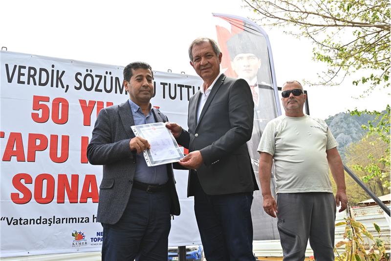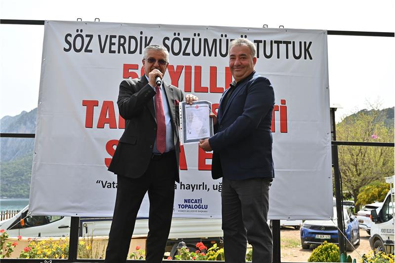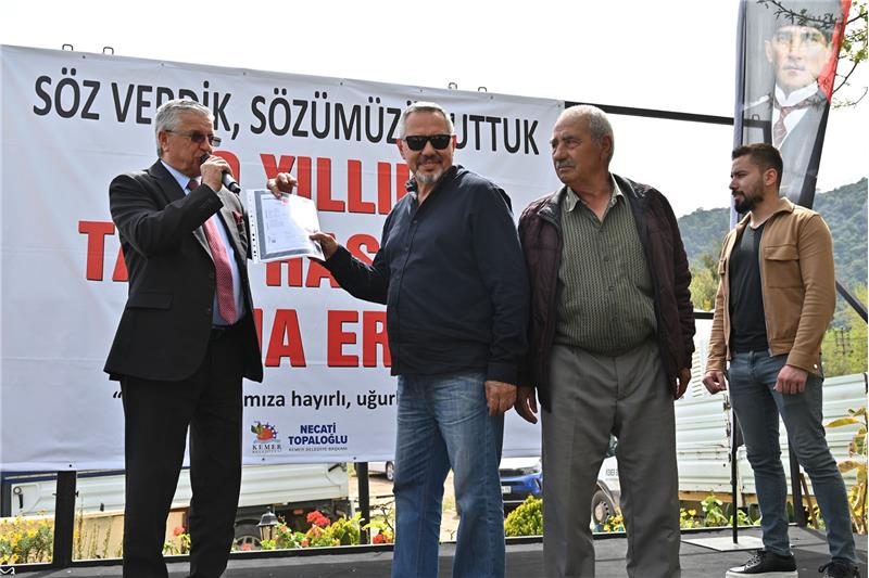 Kemer Belediye Başkanı Necati Topaloğlu, göreve geldiği günden bu yana Kemer ilçe genelinde imar sorununu çözmeye devam ediyor. Pazar günü Beldibi Mahallesi'nde vatandaşların yarım asırlık tapu hasreti biterken, bugün de Kemer'e bağlı Çıralı'da vatandaşlar ilk kez tapu almanın mutluluğunu yaşadı.