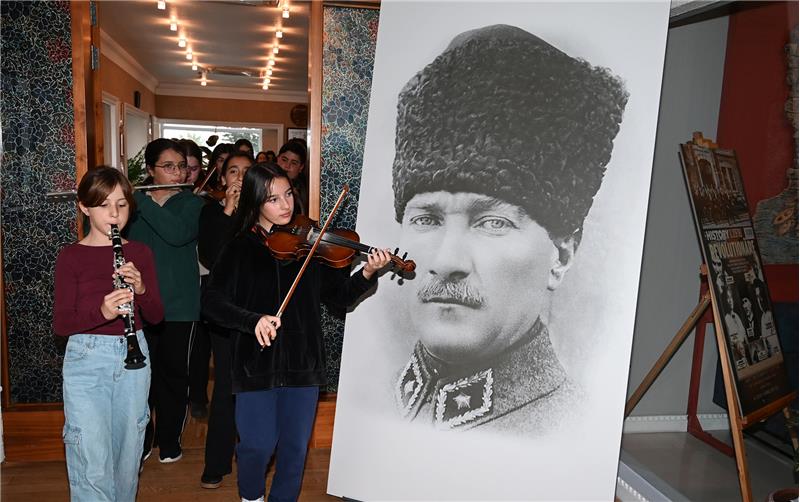 Kemer Belediye Başkanı Necati Topaloğlu'nun öncülüğünde kurulan Kemer Belediyesi Gençlik Orkestrası üyeleri, ellerindeki enstrümanlarla İzmir Marşı'nı çalarak başkanlık makamına çıktı.
