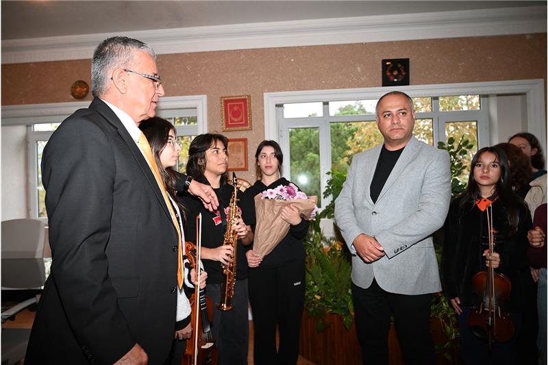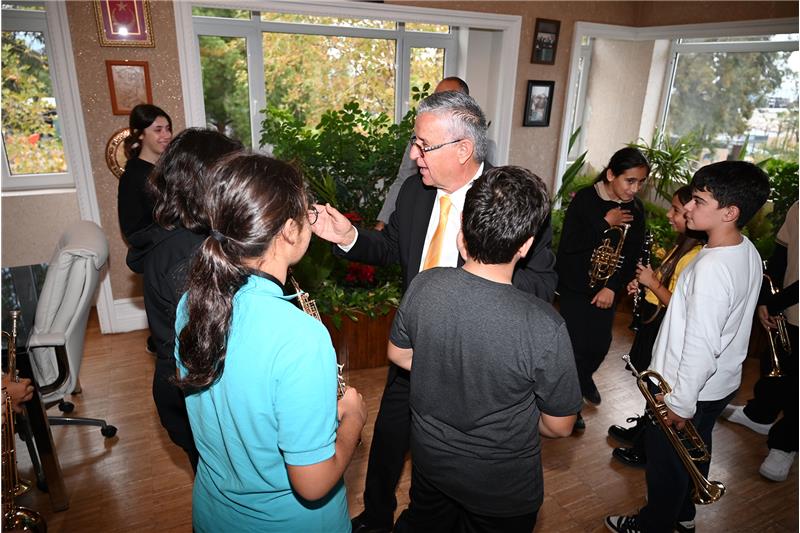 Kemer Belediyesi ATSO Eğitim ve Sanat Merkezi'nde ücretsiz müzik eğitimi alan Kemer Belediyesi Gençlik Orkestrası öğrencileri, Orkestra Şefi Furkan Üstündağ ile Öğretmenler Günü dolaysıyla Kemer Belediye Başkanı Necati Topaloğlu'nu ziyaret ederek gününü kutladı.
