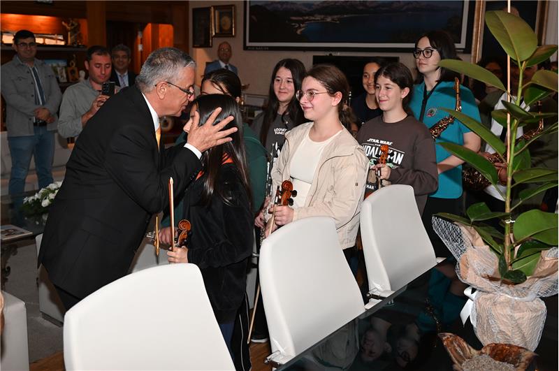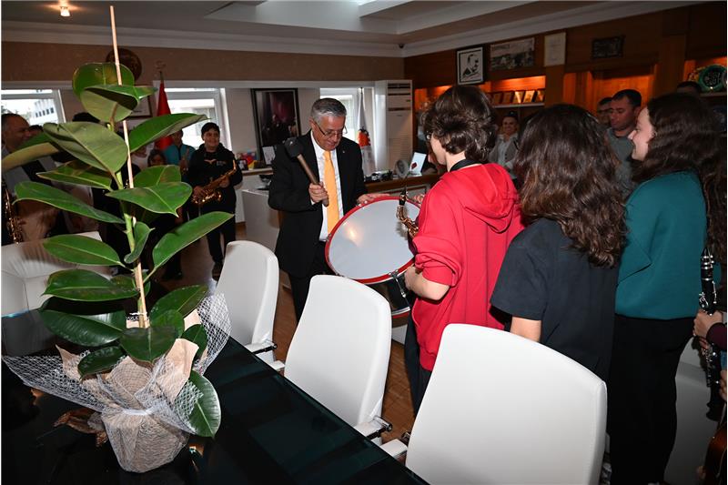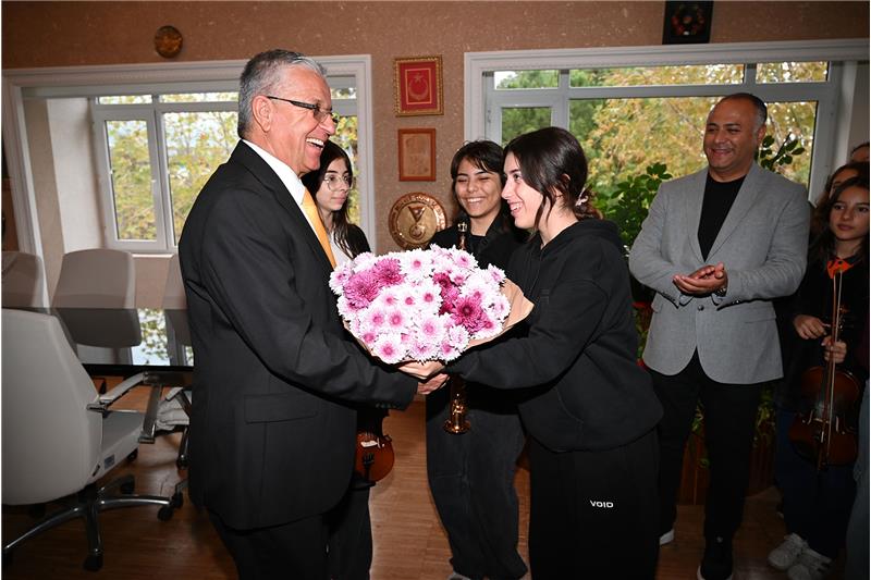 Geleceğin müzisyenlerini makam kapısında karşılayan Başkan Topaloğlu, öğrencilerin sürprizi karşısında duygu dolu anlar yaşadı.