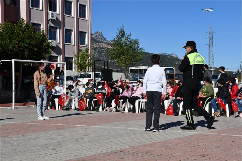 İçişleri Bakanlığı'nın “Güvenli Okul” ve “Bir Hareketine Bakar Hayat” projeleri kapsamında öğrencilerde trafik bilinci oluşturmak için öğrencilere temel trafik kuralları anlatıldı.