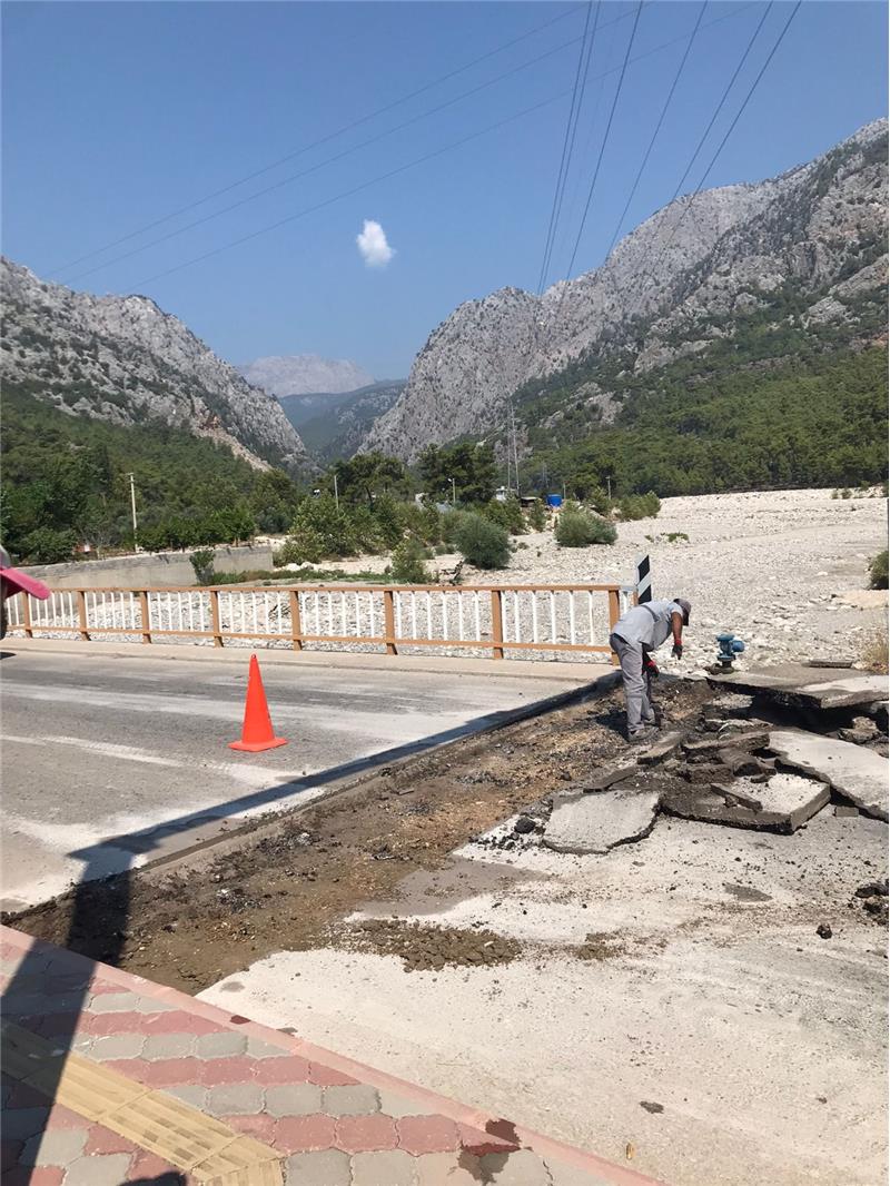 Kuzdere Mahallesindeki arızalı ve bozuk yolların tamiri ve yama asfalt çalışması yapan belediye ekipleri, Arslanbucak Mahallesi Cumhuriyet Caddesi üzerindeki köprü önünde de bozuk olan yolun asfalt yama işlerini tamamladı.