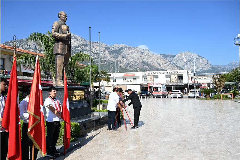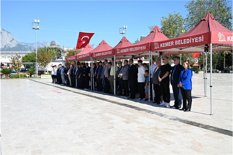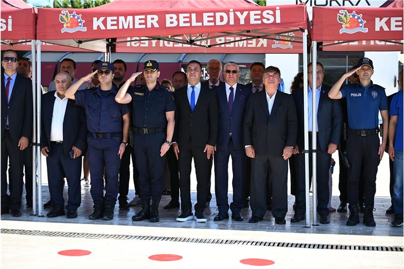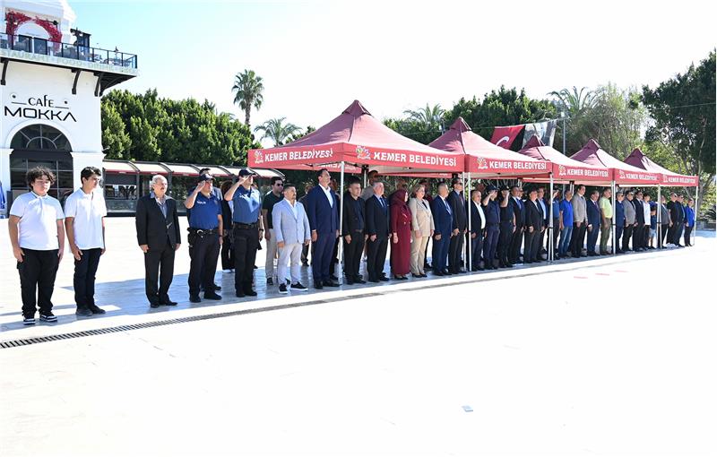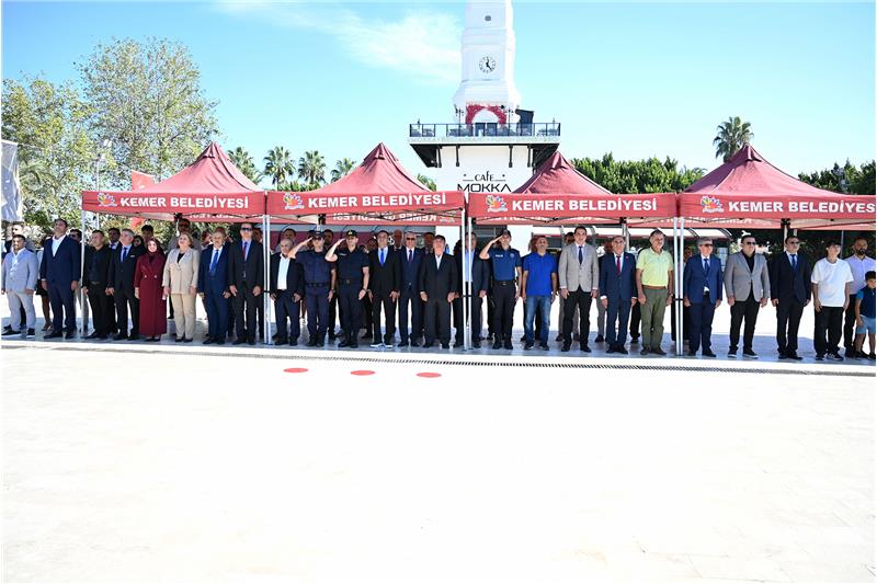 Kemer Cumhuriyet Meydanı'nda düzenlenen törene, Kemer Belediye Başkanı Necati Topaloğlu, Kemer Jandarma Komutanı Ömer Seyhan, Kemer Belediye Başkan Yardımcısı Semih Top, Kemer Sahil Güvenlik Komutanı Burak Gökçe Gökmen, Kemer Belediye Meclis Üyesi Mustafa Bilici, Arslanbucak Mahalle Muhtarı Pınar Balaman, Beldibi Mahalle Muhtarı Bayram Ali Talih, Beycik Mahalle Muhtarı Caner Kavuz, Çamyuva Mahalle Muhtarı Rıdvan Vicir, Göynük Mahalle Muhtarı Sadık Şen, Kiriş Mahalle Muhtarı Faiz Çetin, Kuzdere Mahalle Muhtarı Serkan Günay, Merkez Mahalle Muhtarı Yusuf Salova, Ovacık Mahalle Muhtarı İsa Anatürk, Tekirova Mahalle Muhtarı Mustafa Barış, Ulupınar Mahalle Muhtarı Salih Sarıca, Yeni Mahalle Muhtarı Münevver Erkal, STK temsilcileri, siyasi parti temsilcileri ile kamu kurum ve kuruluşlarının temsilcileri katıldı.