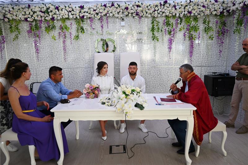 Kemer Belediye Başkanı Necati Topaloğlu'nun kıydığı nikahta, 'Hiçbir baskı altında kalmadan evlenmek istiyor musunuz' sorusuna çift Türkçe olarak 'Evet' karşılığını verdi.